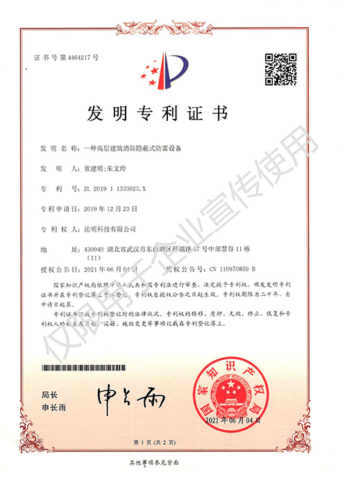 (发明)2-一种高层建筑消防隐蔽式防雷设备-专利证书1