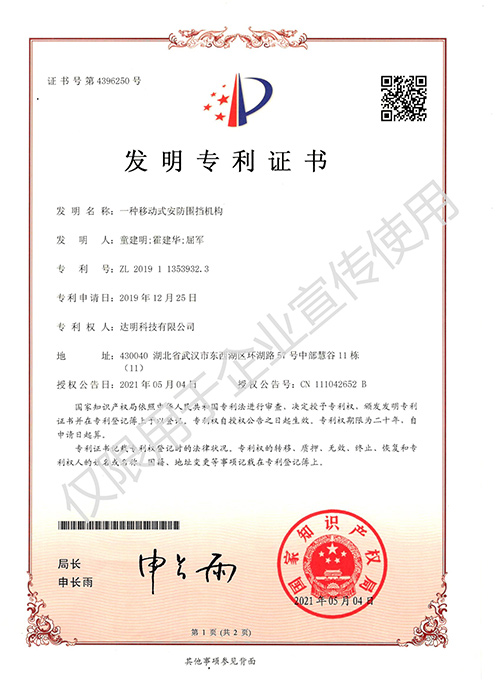 (发明)3-一种移动式安防围挡机构--专利证书1